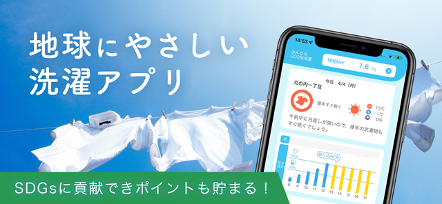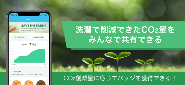 毎日の洗濯で「乾燥機利用の有無」をレポートすることで、CO2削減量が記録され、アプリ利用者全体で削減できたCO2量を共有できます。さらにCO2削減量に応じてバッジを獲得することができ、SDGsへの参加意識が高まります。