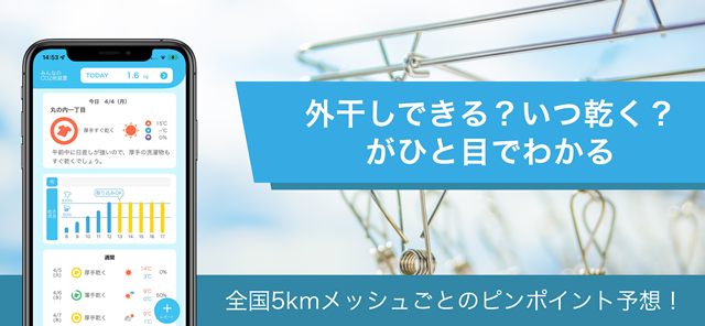 はれほすでは、「気温」「湿度」「風」「日射量」「降水」などの気象要素から1時間ごとの洗濯物の乾きやすさを計算し、洗濯指数や取り込み可能時間を高精度に予想します。また、全国を5kmごとに詳細なメッシュ単位で予想し、利用する場所に最適な情報をお届けできます。